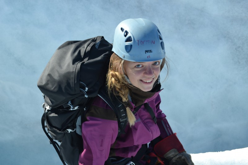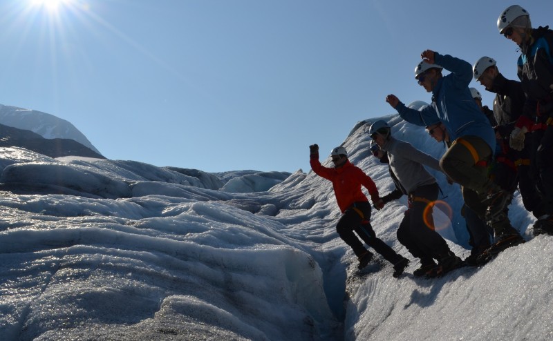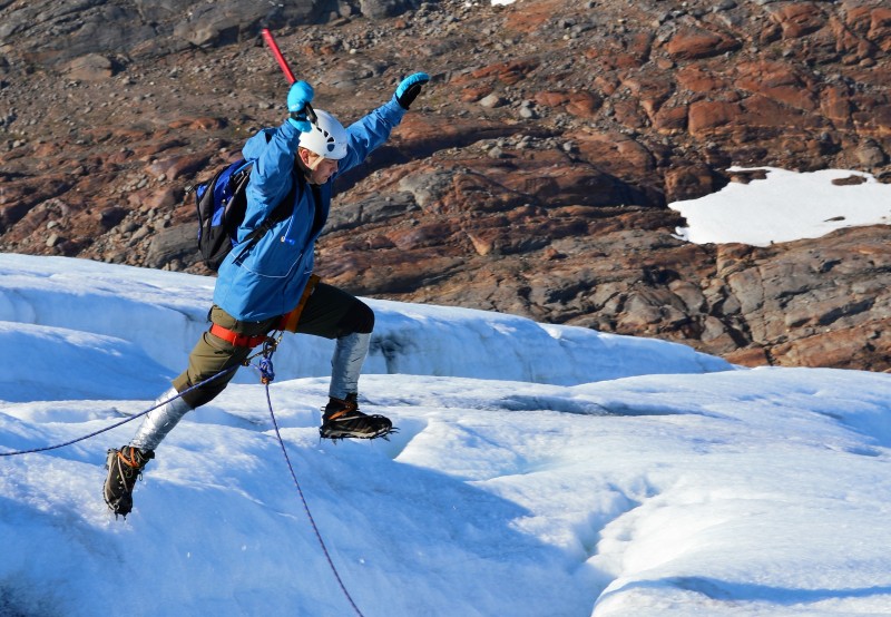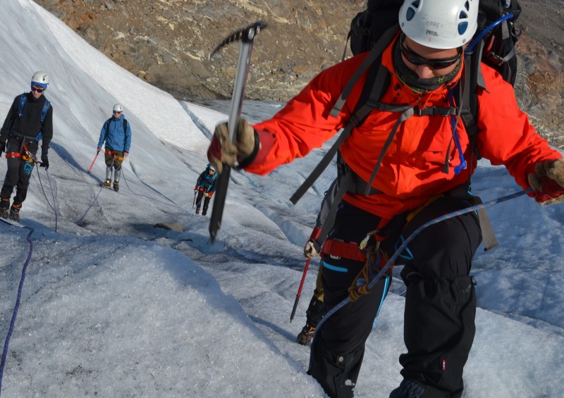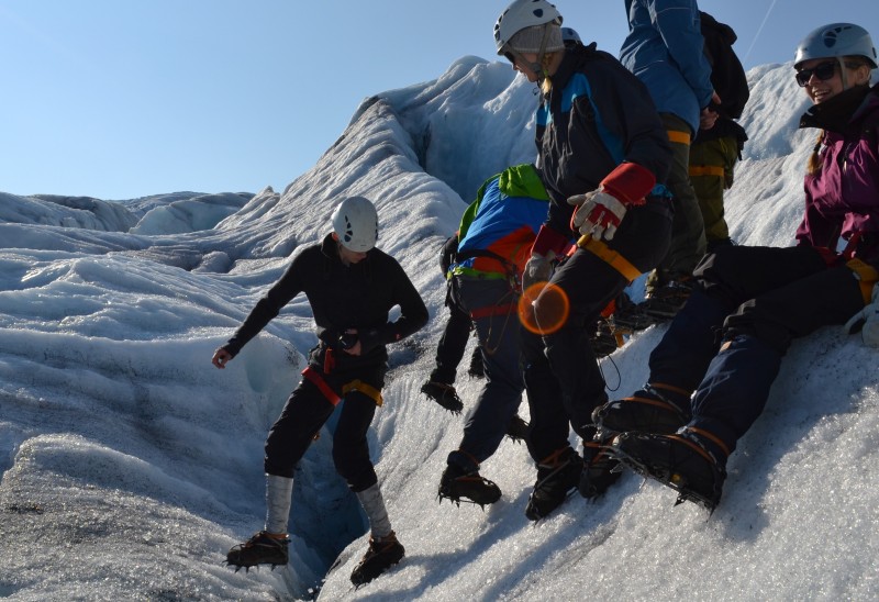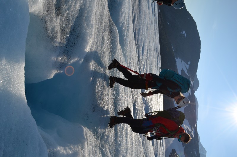 Oppe i den mer oppsprukne delen av breen øvde vi på stegjernsteknikk, hvordan å bruke stegjernene fornuftig, før vi ble knytt i taulag og skulle inn i den skikkelig røffe delen av breen. En god øvelse var å gå baklengs opp bratte, nesten vertikale bakker. Ganske gøy, ganske vrient, men alle fikk det veldig bra til! Nå var det på tide med litt mer action, og vi bandt oss inn i to taulag. I strålende sol og med sommerfulger i magen gikk vi bundet sammen inn i den oppsprukne blåisen.