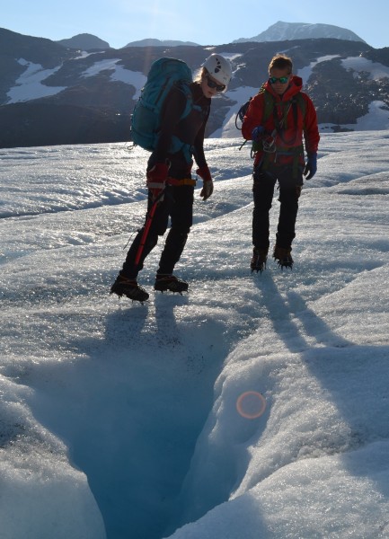 Sprekkene begynte å åpne seg, og godt sikret i taulag fikk vi kjenne litt på hvor grensa for høydeskrekk går for hver av oss. For enkelte var høydeskrekken tydeligvis lagt igjen hjemme. Maria tar en liten pause på en isrygg med ti meter kløfter på begge sider, og Robin vil helst hoppe alt som kan hoppes.