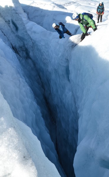 Vi får streng beskjed av Jan Inge om ikke å gå på snø, da denne kan skjule sprekker i isen. Vi fant flere eksempler på slike sprekker som gikk til underjordiske fosser mens vi gikk oppover breen.