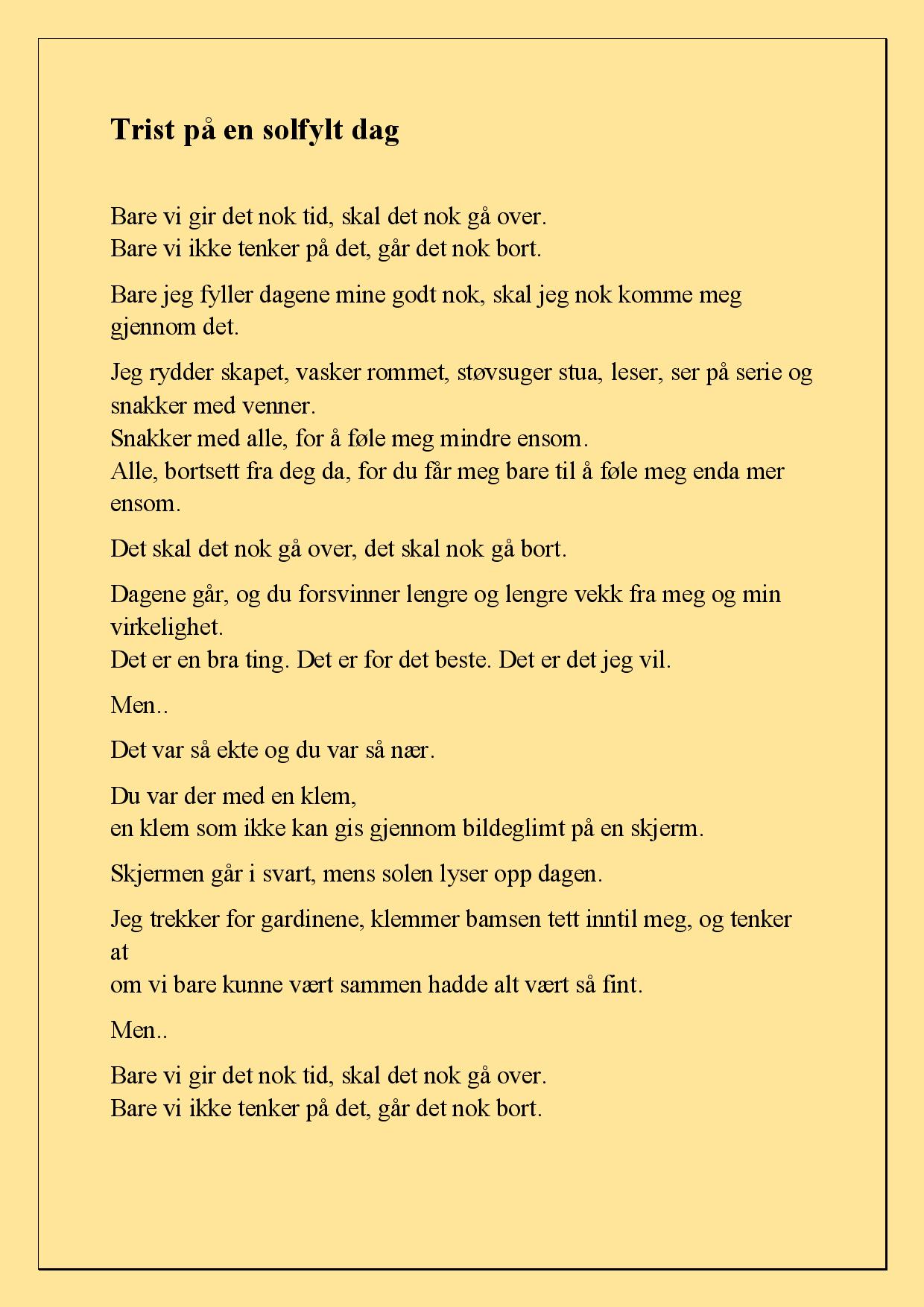 Send meg en VALGFRI TITTEL INNEN KL. 16 I DAG. Titlene skal så videresendes til noen andre på gruppa, som skal bruke tittelen til å lage noe. Forslag til hva man kan lage ut fra tittelen: Tegning, maleri, fortelling, monolog/dialog, sang, rap, dikt, dans, film etc. Dere står helt fritt til å velge uttrykksmåte. Det eneste kriteriet er at dere bruker tittelen som utgangspunkt for det dere lager. Dere får frem til kl. 16 i morgen for å gjennomføre oppgaven.